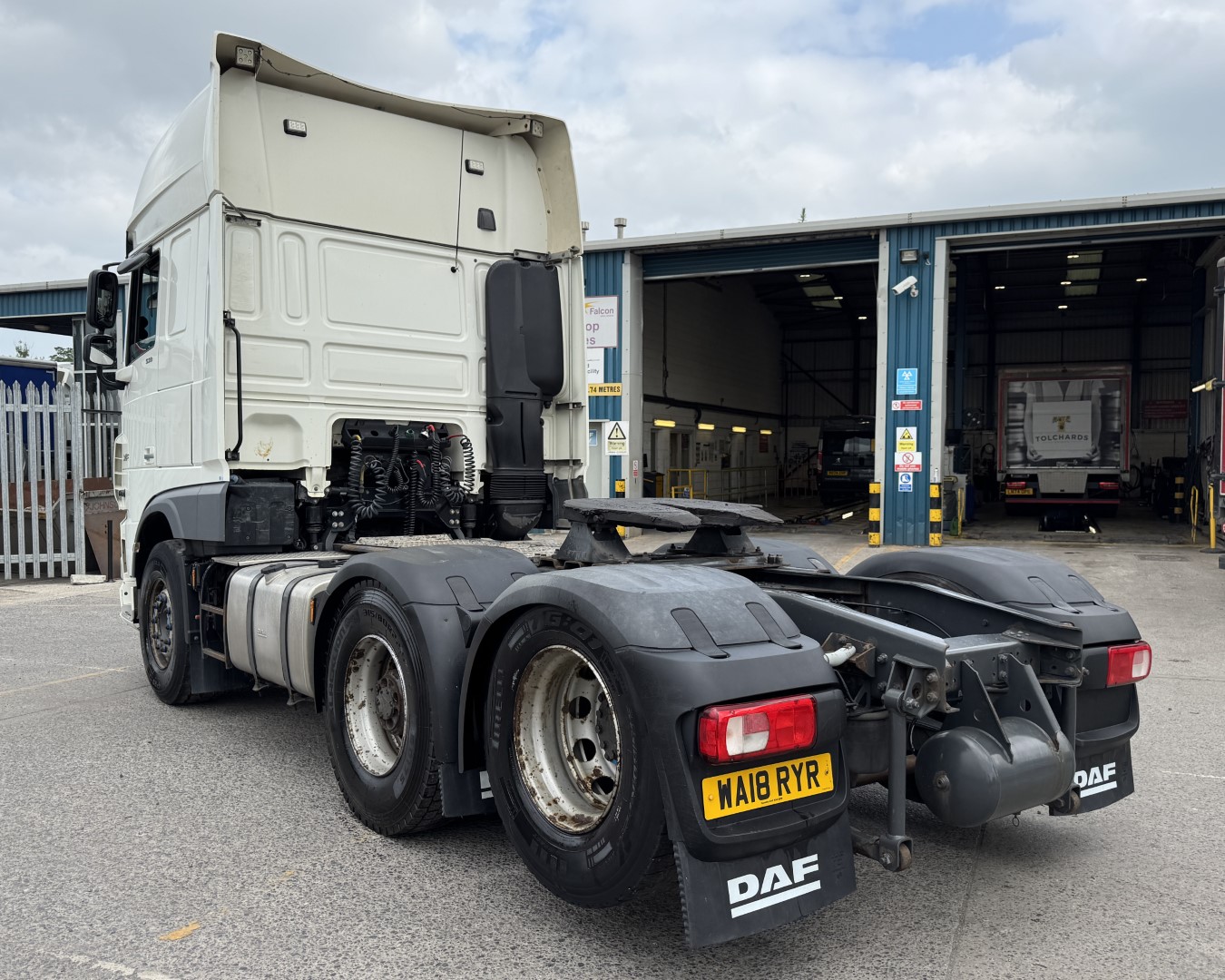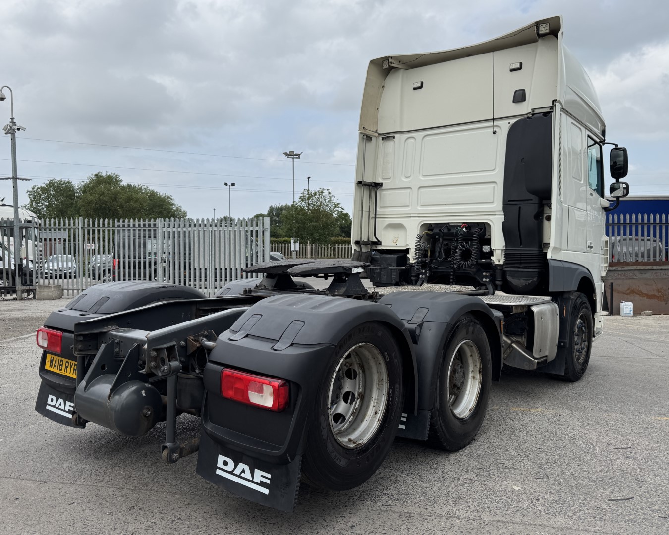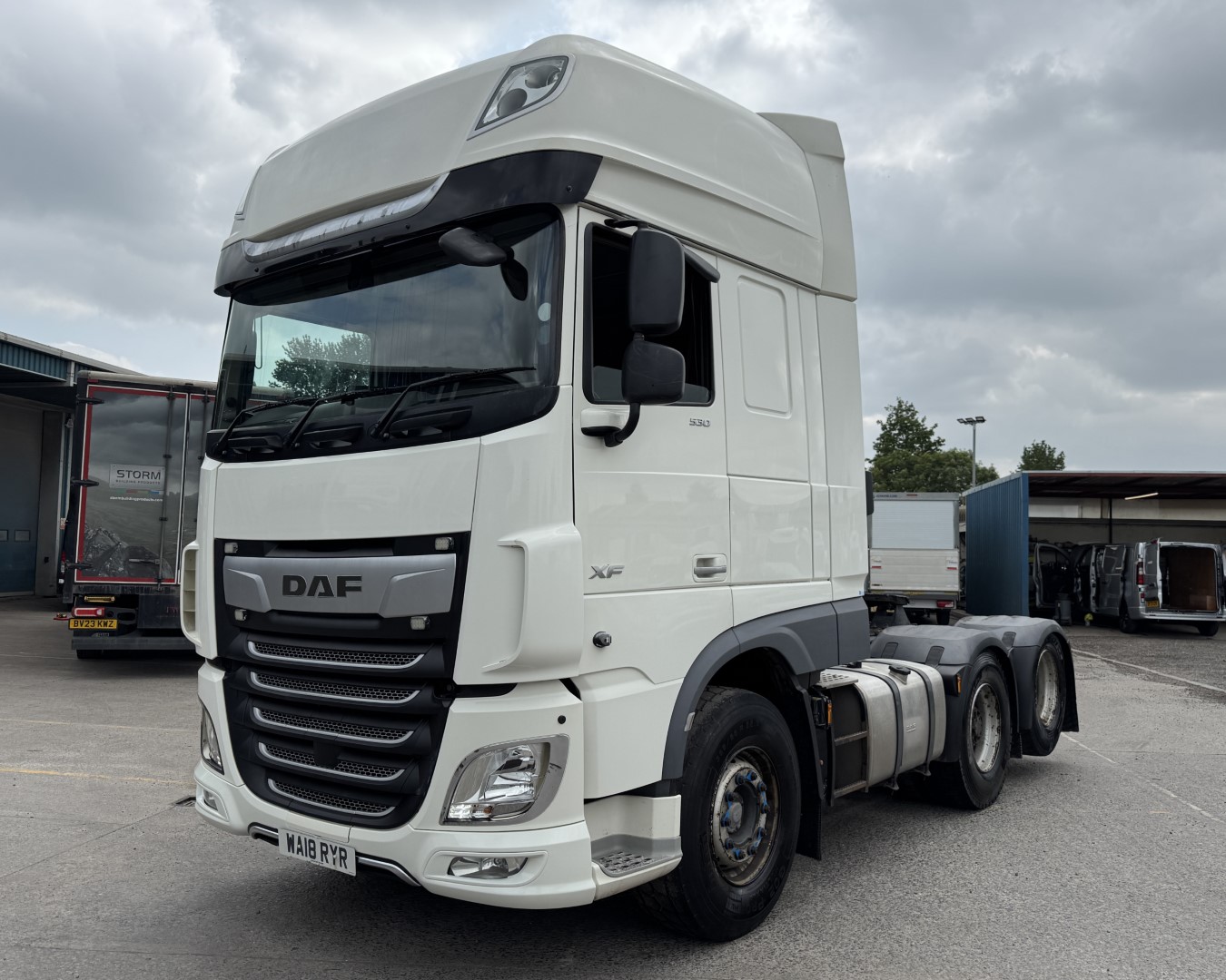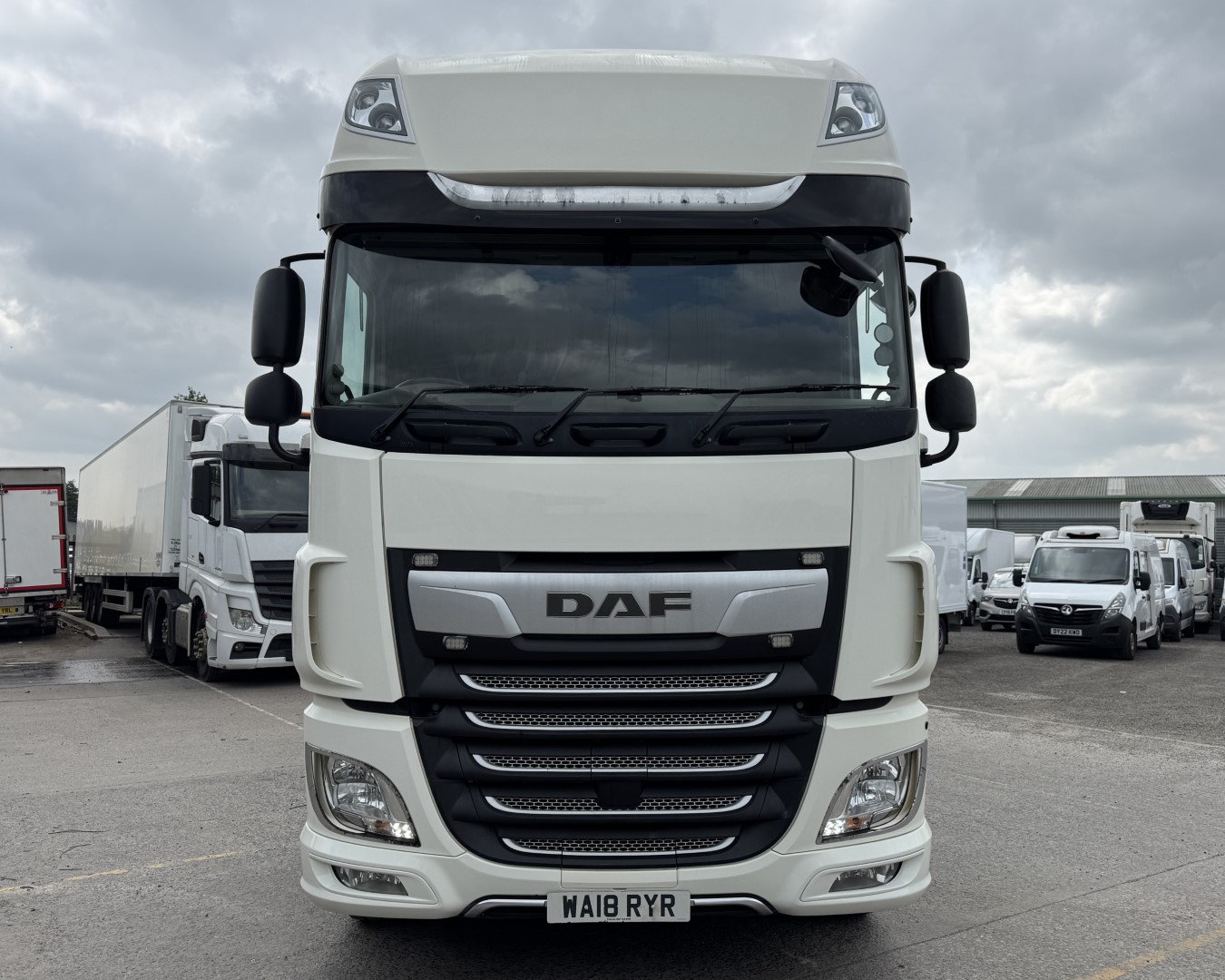 2018 (18) DAF XF 530 FTS Super Space Cab (16-Speed Manual) 80 Tonne 6×2 T/Unit, 12902cc engine, Special types GTW 80,000kg, MX engine brake, 16-speed manual gearbox, High roof double bunk, Fitted fridge, Fitted DAF Microwave, Air conditioning, JOST cast iron 5th wheel coupling, Electronic & heated side mirrors, Electric windows, Cruise control + speed limiter, Bluetooth with handsfree calling, Heated windscreen, Trip computer.
