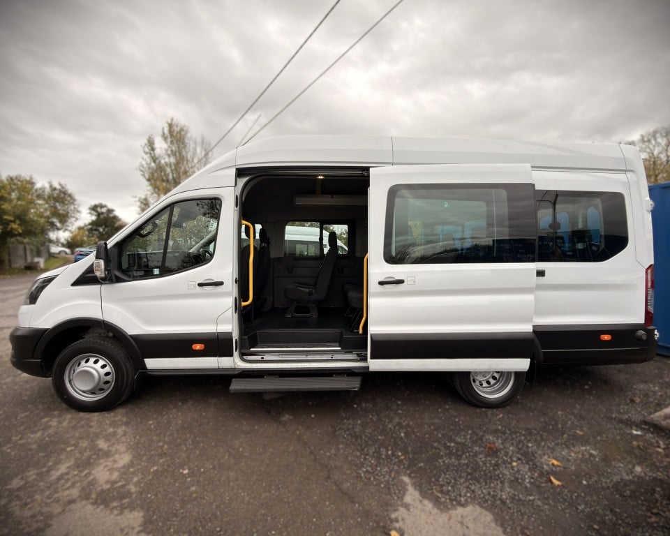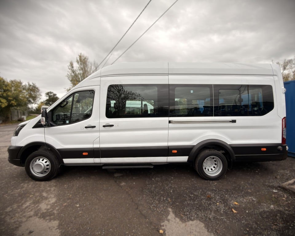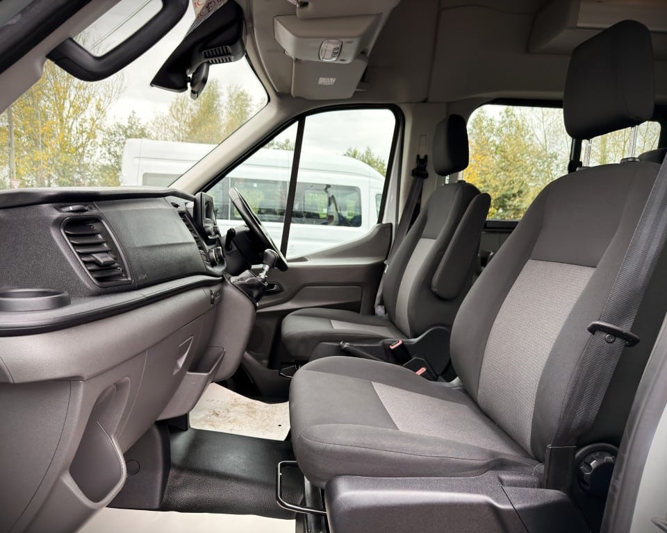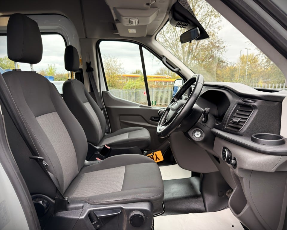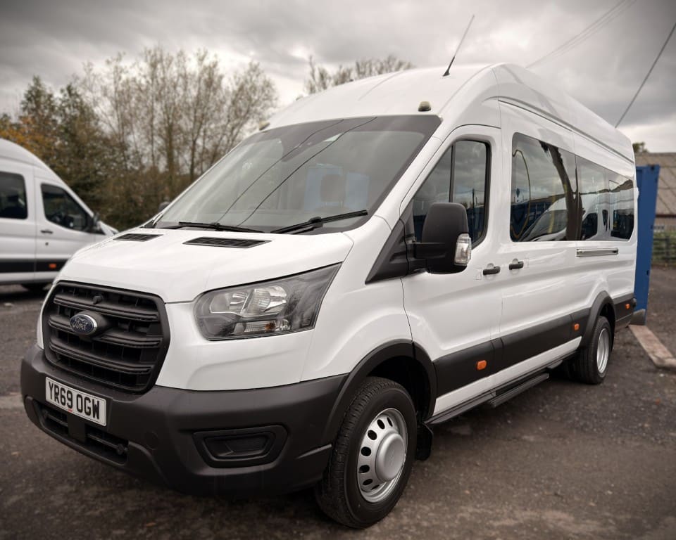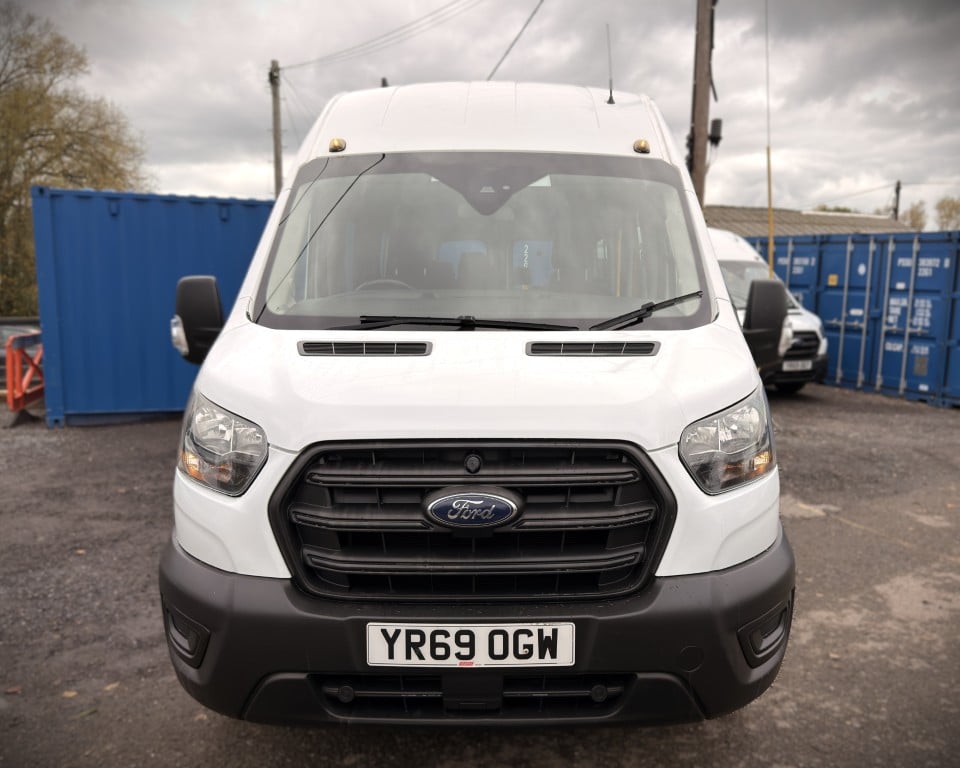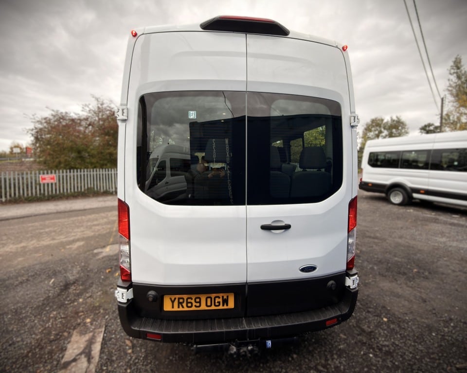 2019 (OGW) Ford Transit 2.0 460 EcoBlue Trend RWD L4H3 17 Seat Minibus (PSV), 2 litre diesel engine with a 6-speed manual gearbox, Digital tachograph, PSV specification, 17-seats (including driver), Cruise control with speed limiter, Tow bar, Passenger overhead luggage compartments, NS Sliding passenger door with retracting step, Automatic headlights, Electric side mirrors and windows, Remote central locking, DAB radio, Bluetooth with handsfree calling and steering wheel controls, Trip computer.