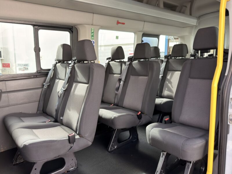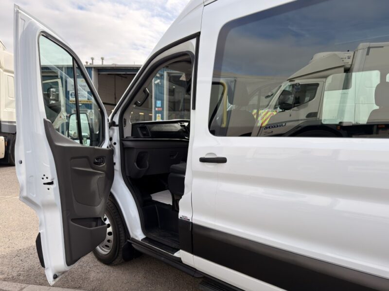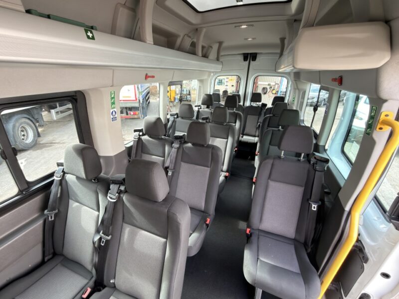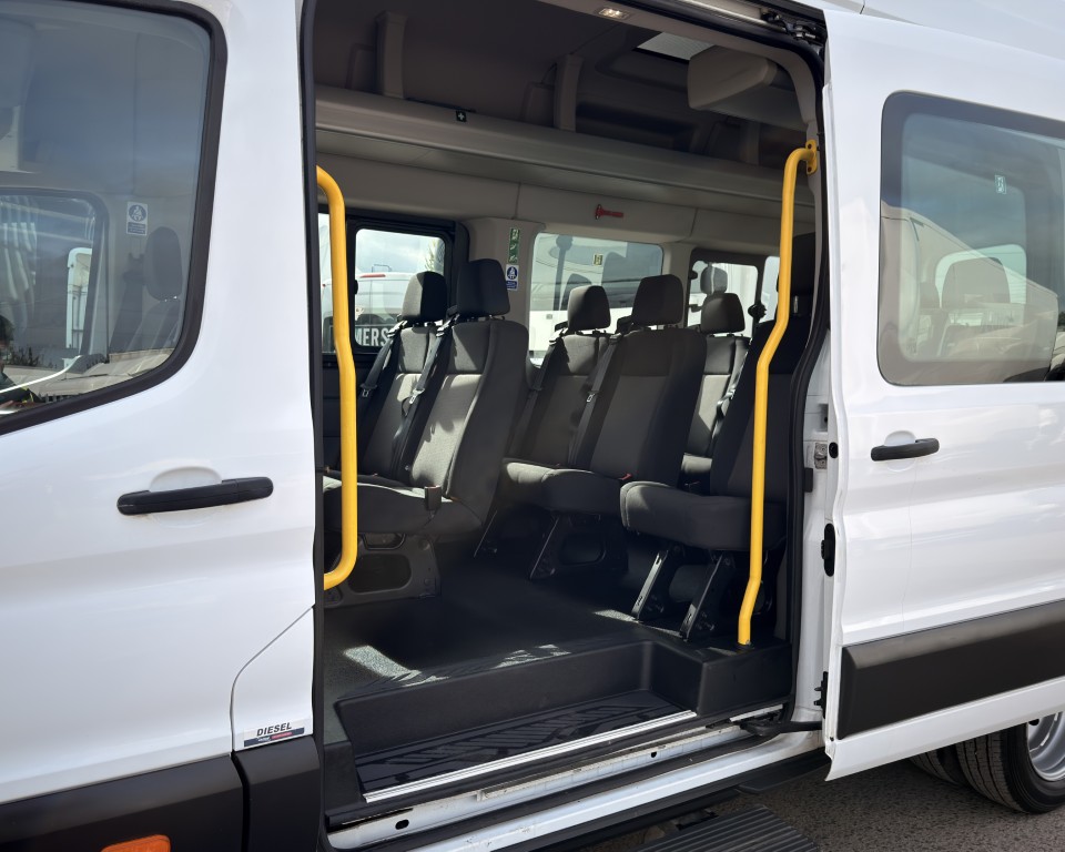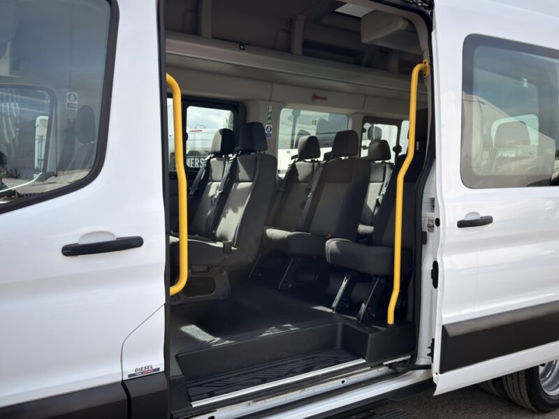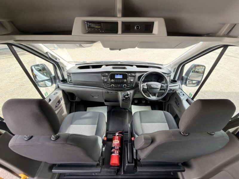 2019 (69) Ford Transit 2.0 460 EcoBlue Trend Minibus L4H3 17 Seat Minibus (PSV), 2.0 Diesel engine with a 6-speed manual gearbox, Tow Bar, Digital tachograph, PSV MOT, 17-seats, Nearside sliding passenger door with retracting step, Internal passenger overhead luggage storage, Automatic headlights, Electric side mirrors and front windows, Remote central locking, Cruise control with speed limiter, Bluetooth connectivity with handsfree calling and steering wheel controls, Trip computer.